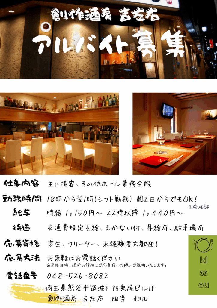 | 店名 | 創作酒房 吉左右 ( ソウサクシュボウ キッソウ ) |